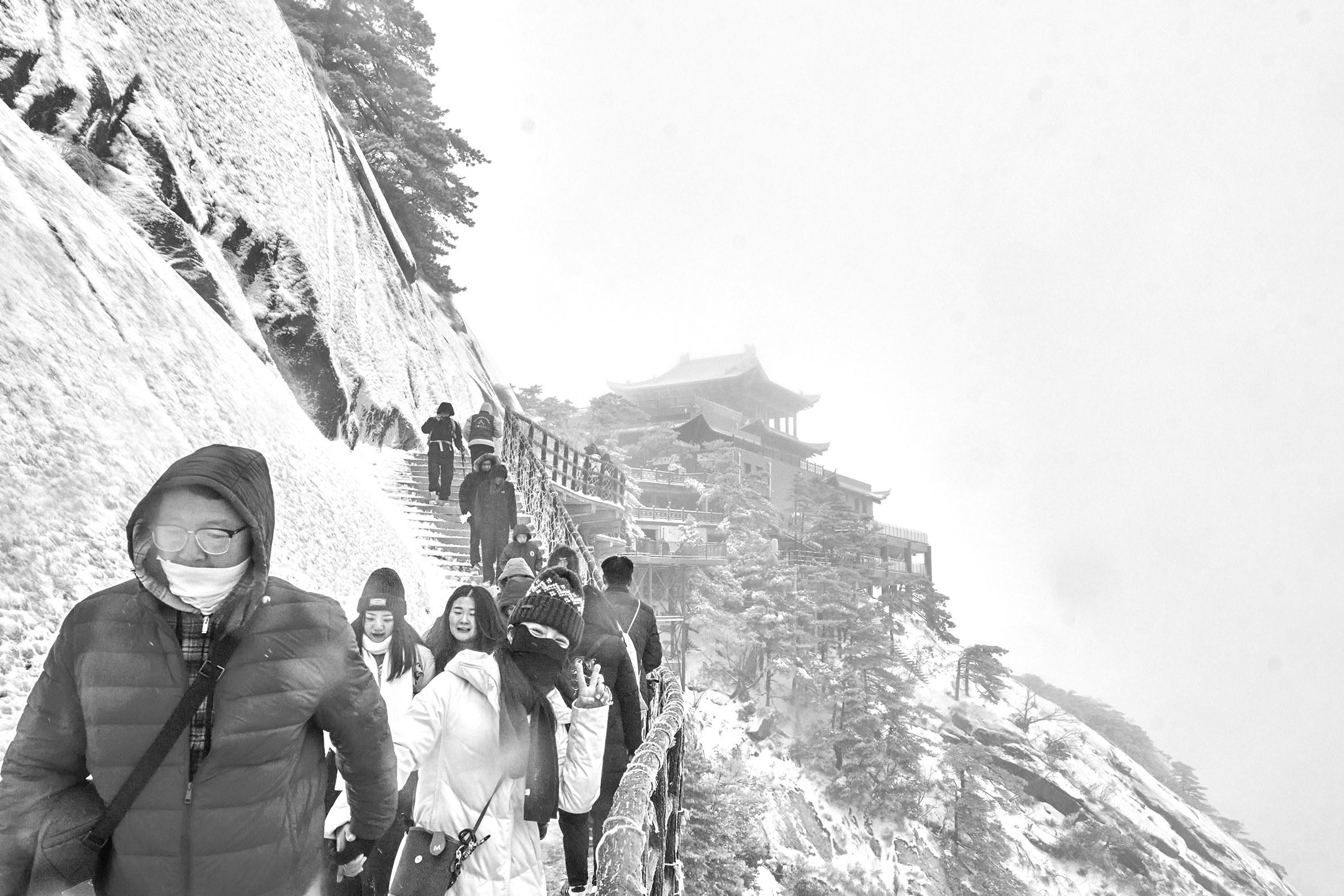 今年元旦小长假期间,潜山市文旅活动精彩纷呈,旅游市场活力满满,累计接待游客10.2万人次,实现旅游综合收入4900万元,呈现出安全、有序、优质的良好态势。图为1月1日,雪后初霁的天柱山银装素裹宛若仙境,“皖源天柱·天助我也”主题登山大会吸引万名爱好者参与,他们沿着七条不同线路向主峰进发,活动现场还设有巡游互动与趣味闯关打卡环节,让登山过程成为一场沉浸式的文化体验。通讯员孙国祥吴守江许心雨摄