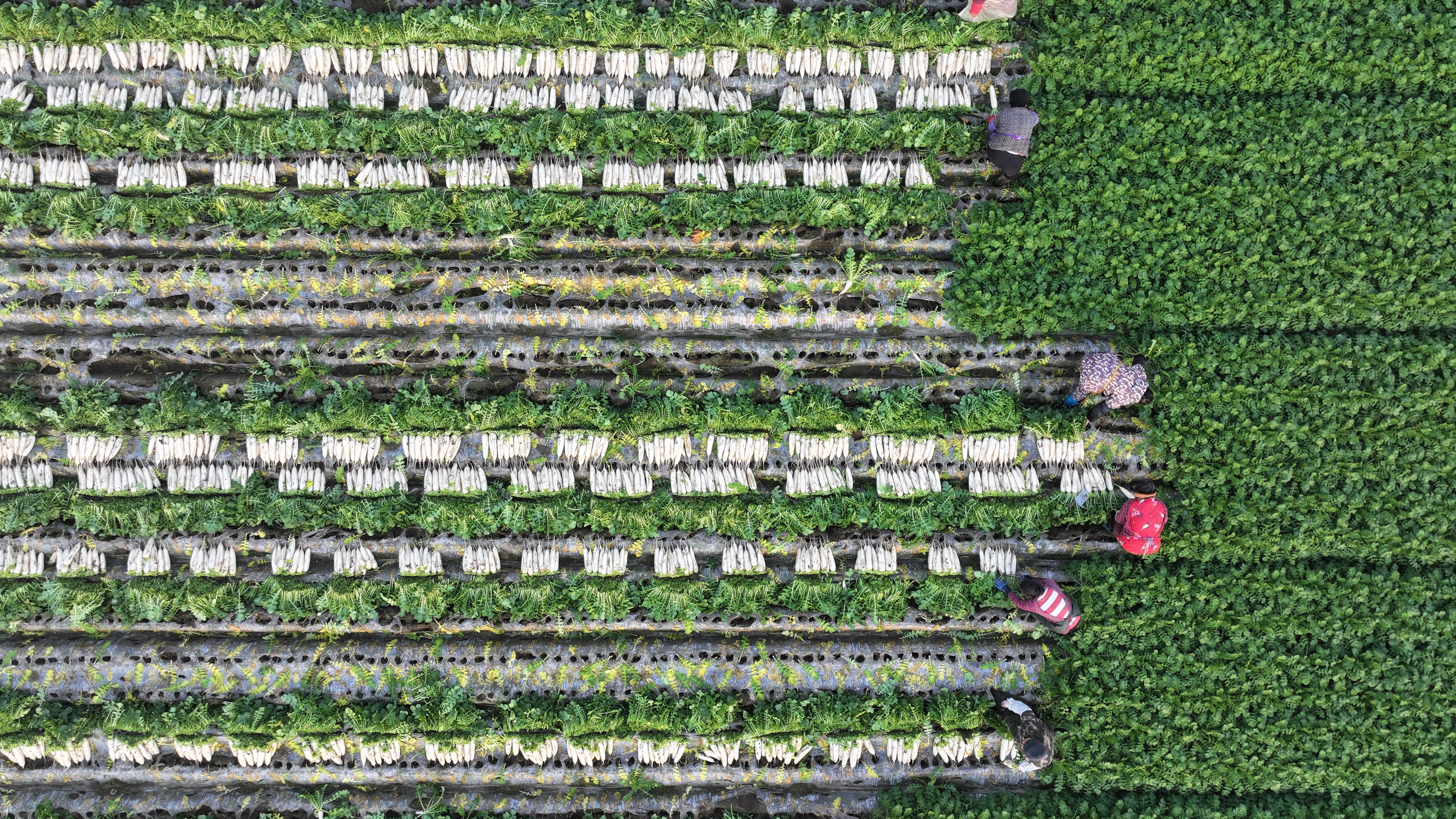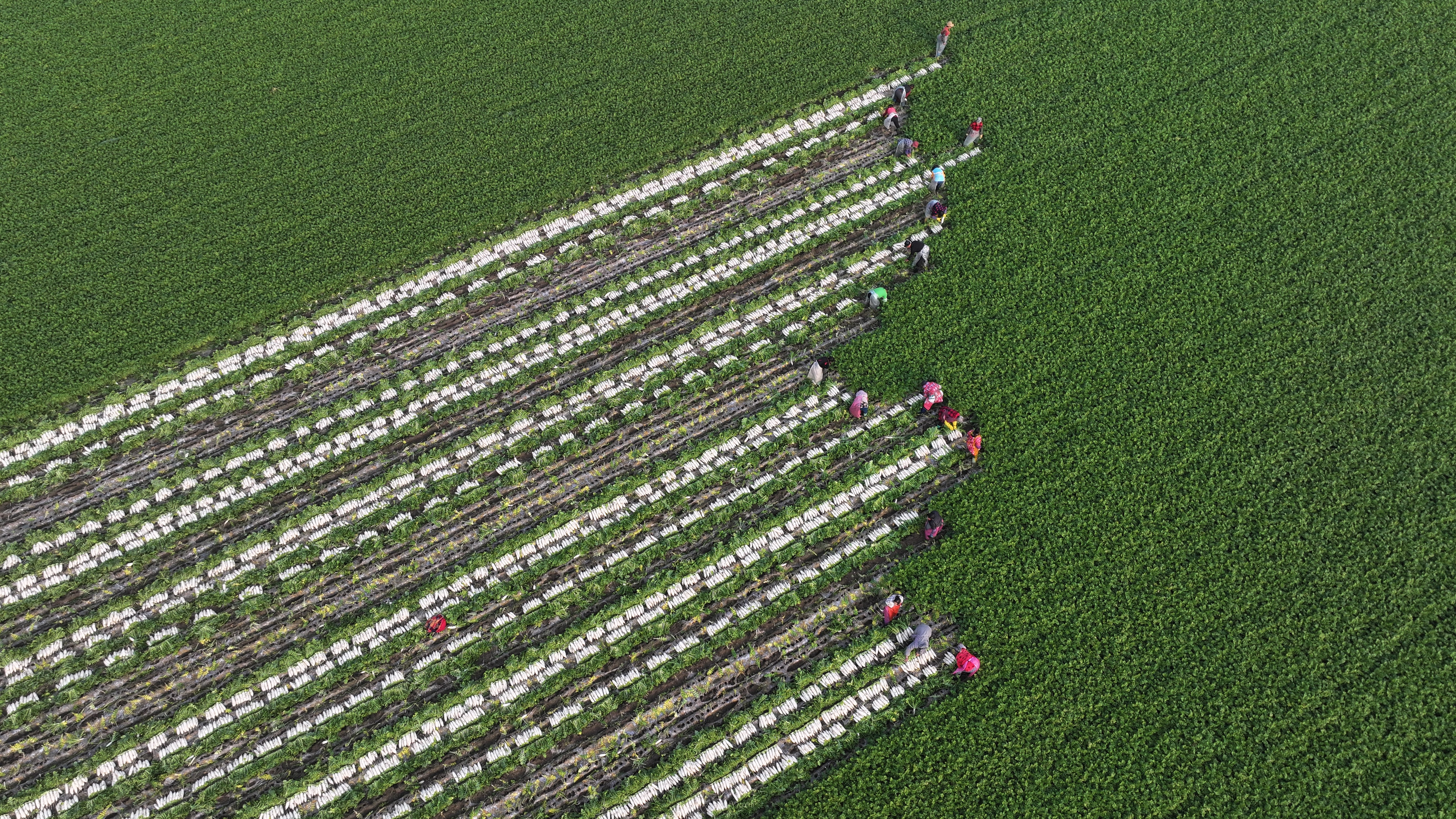 每年9月,播种开始。打窝、覆土、盖膜、破膜引苗,一套流程井然有序。萝卜生长期约80天,为持续供应市场,农户常分2—4批播种,间隔约15天,拉开上市时间。